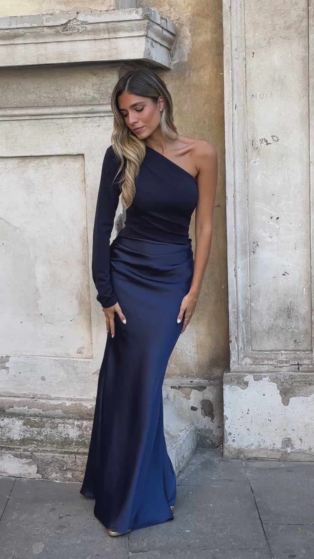 Vestido acetinado assimétrico; com dois matérias diferentes.