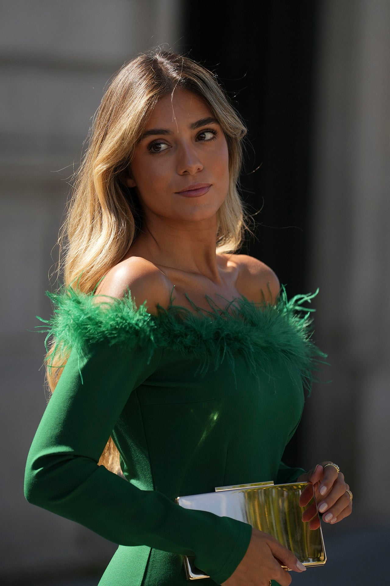 Vestido com plumas; fecho invisível; tecido com elastano