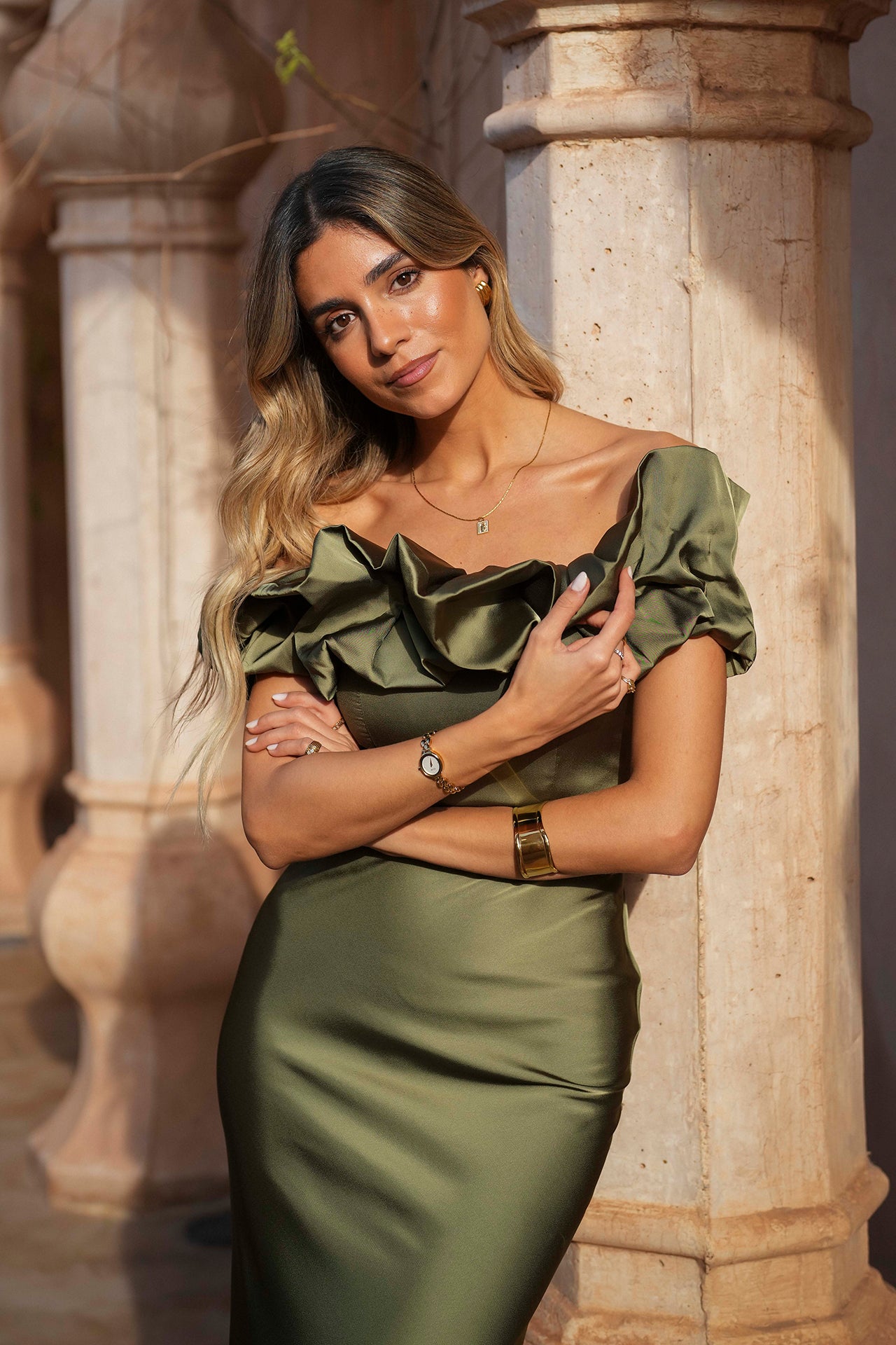 Satin dress with ruffles; the dress has sleeves although in some images it is shown as off-shoulder (can be worn both ways)