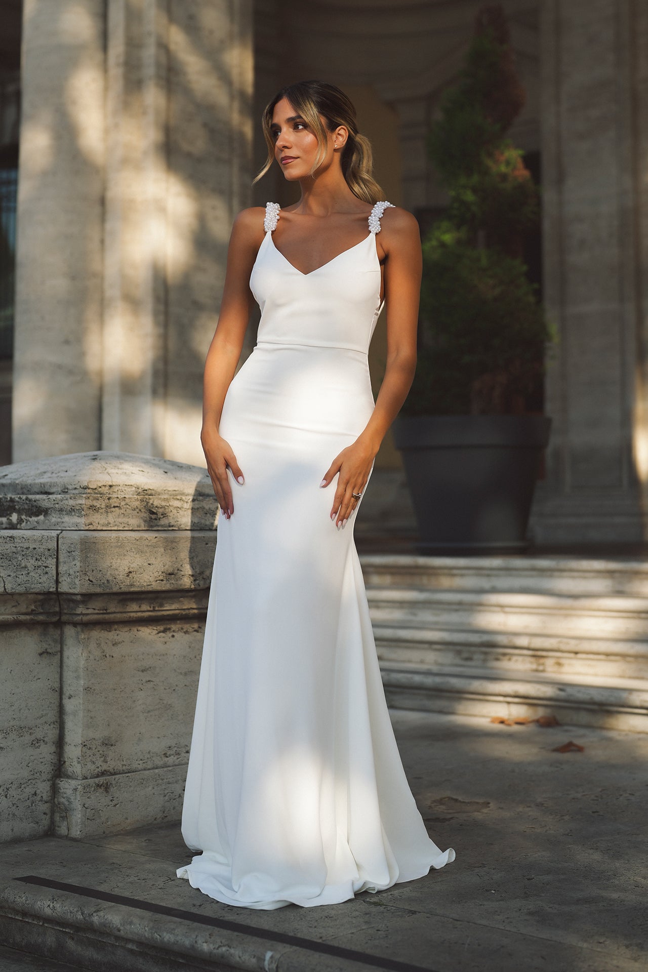Vestido con cola, escote en la espalda; acolchado en el pecho; detalle en las tiras con perlas;