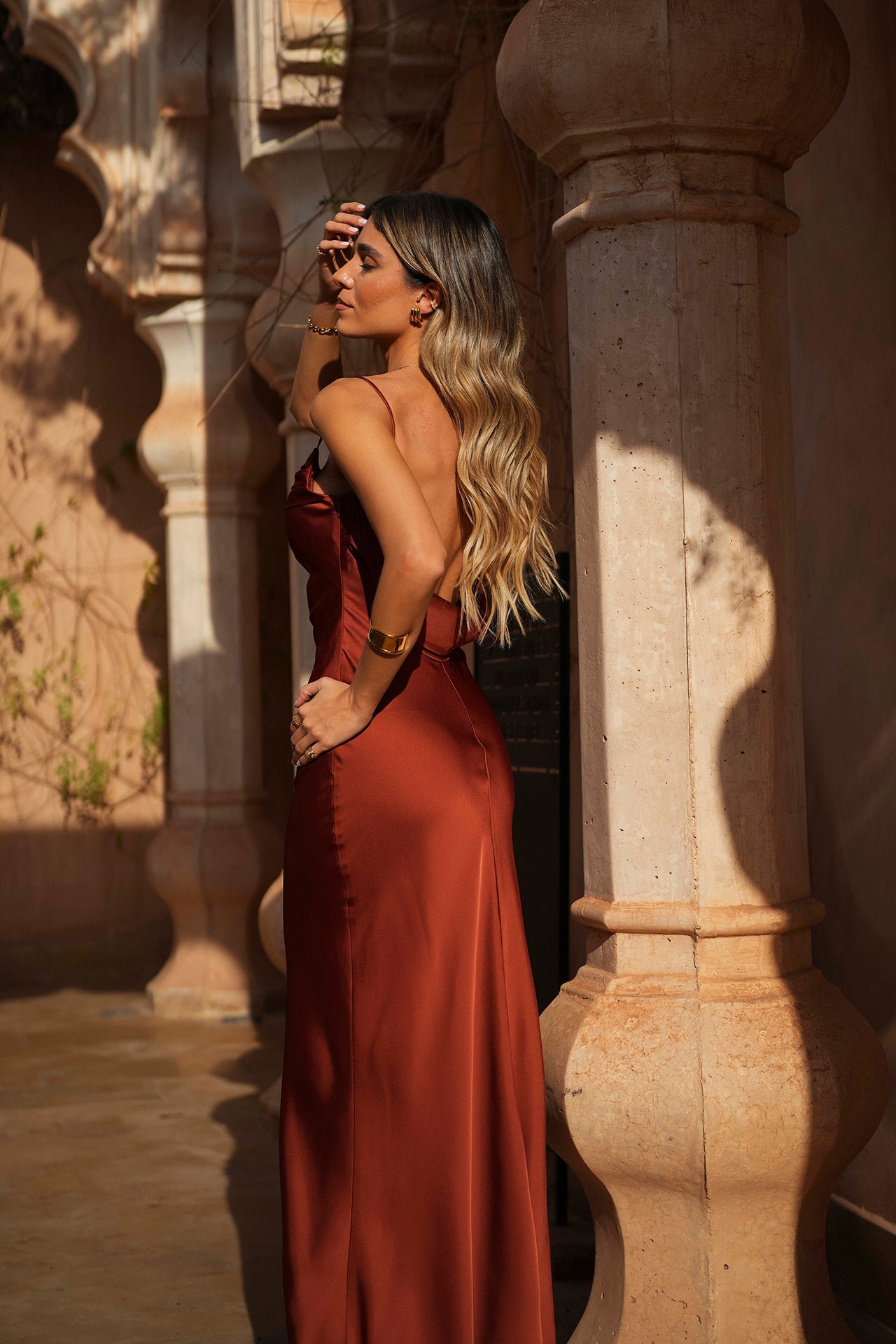 Robe satinée avec décolleté dans le dos ; serrage latéral avec fermeture invisible
