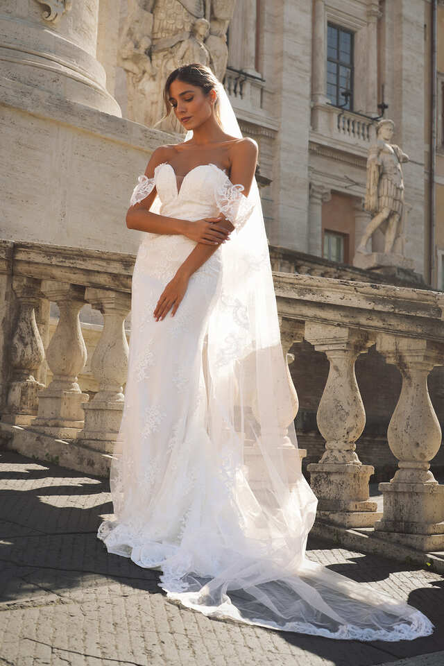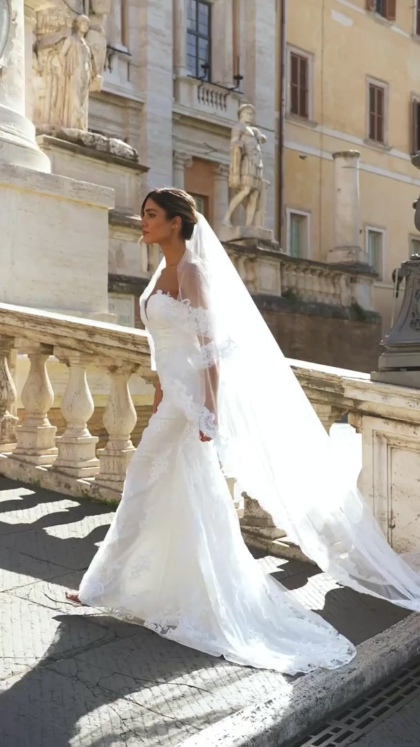Abito in pizzo con lacci sul retro; coppe imbottite; leggero strascico.