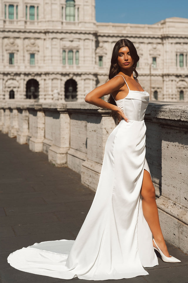 Abito con spacco laterale; seno imbottito. Con strascico.