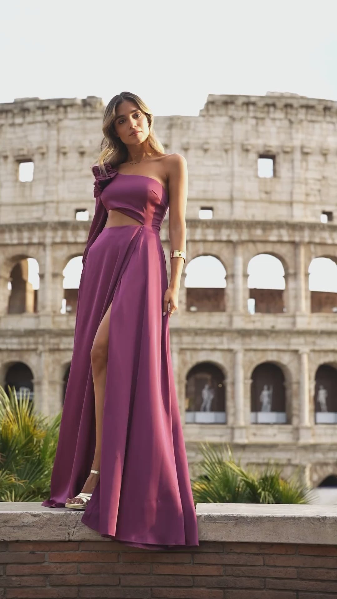 Vestito satinato con apertura sulla pancia; apertura sulla gamba laterale.