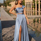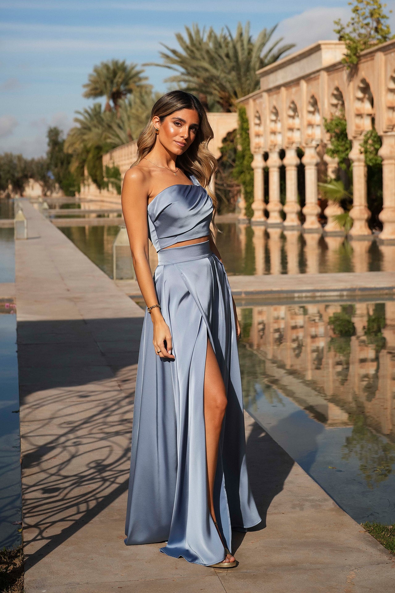 Conjunto acetinado de saia com abertura na perna esquerda e top com copas.
