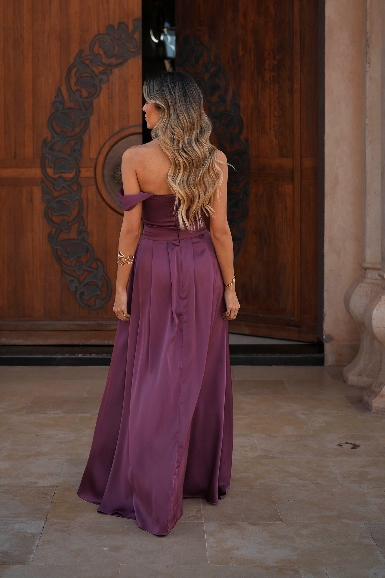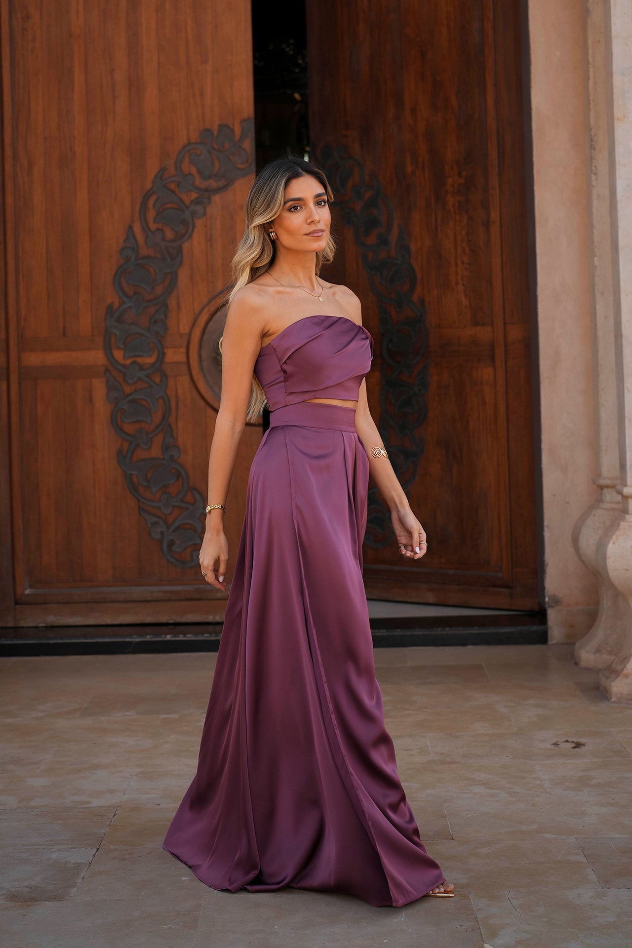 Conjunto acetinado de saia com abertura na perna esquerda e top com copas.
