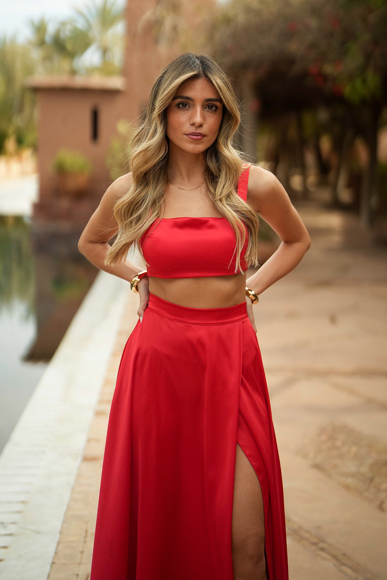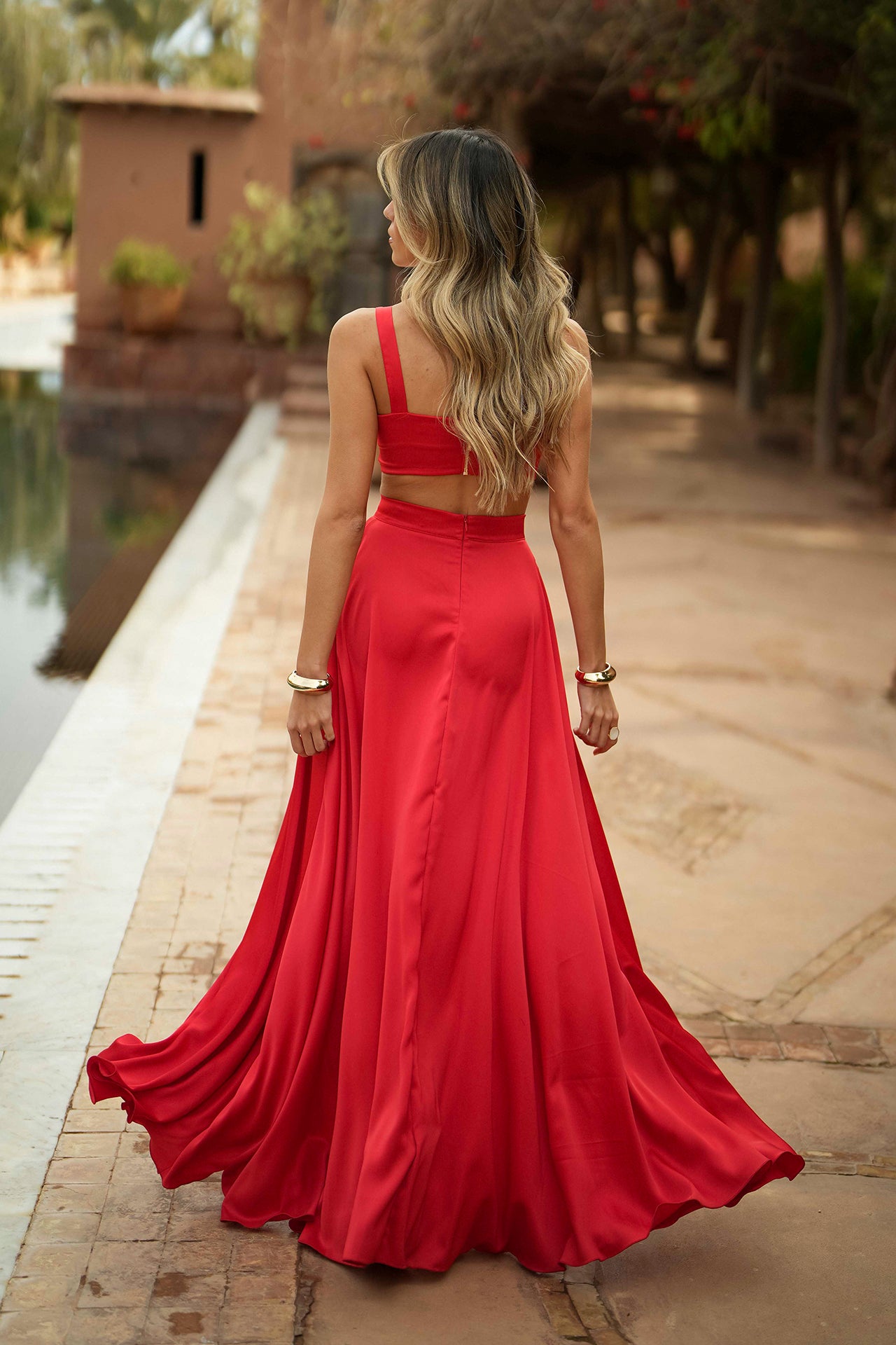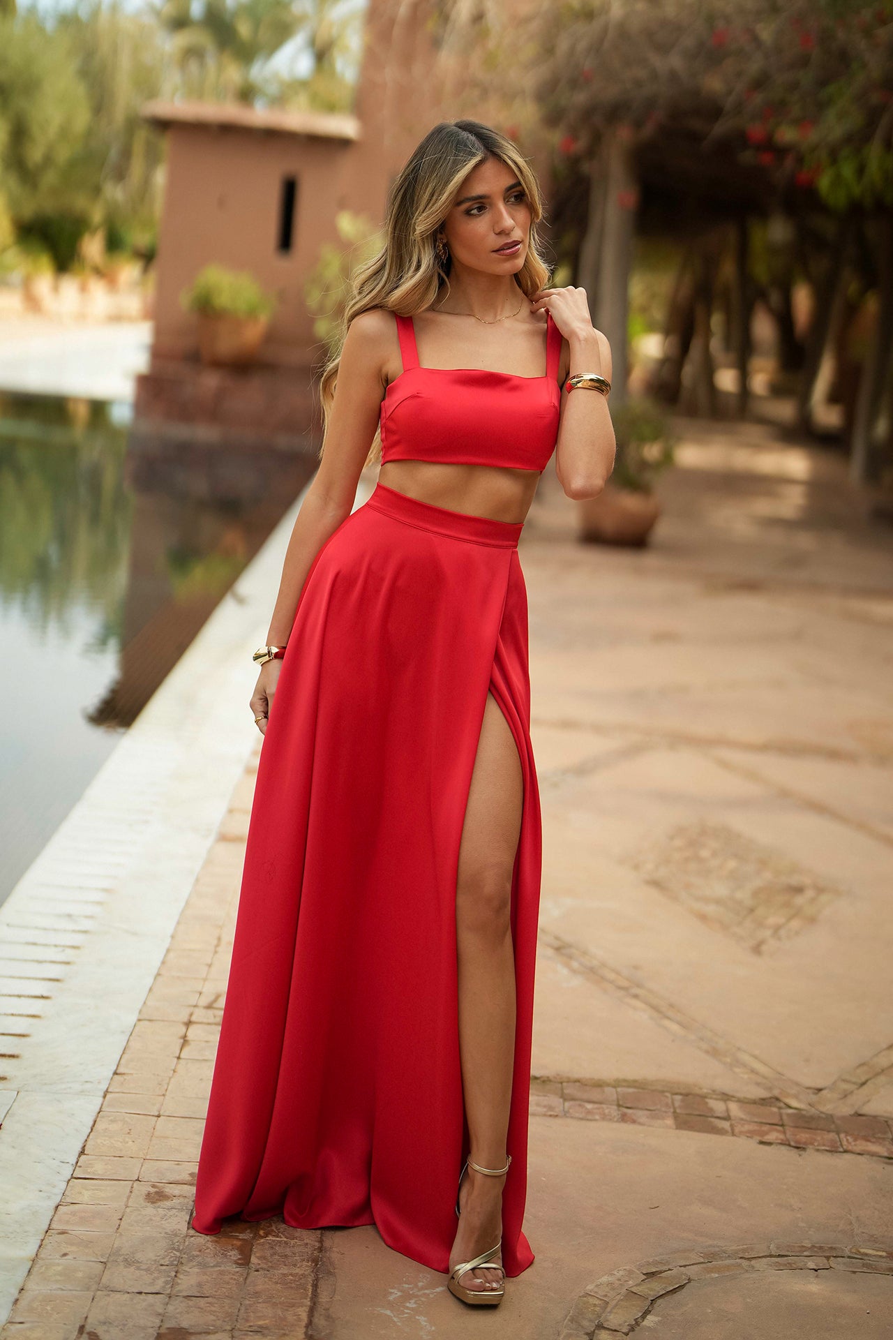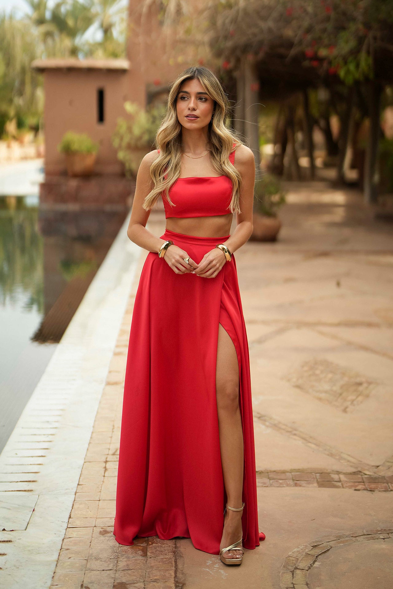 Conjunto acetinado de saia com abertura na perna esquerda e top com copas.